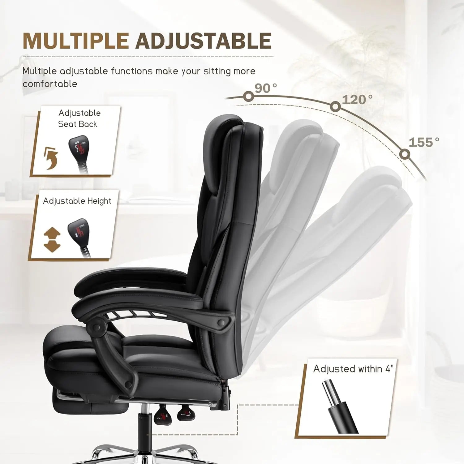 - Flexible adjustments and footrest: seat height adjustable across about 4 inches; backrest from 90° to 155°; retractable footrest for naps or leg relief; ideal for home/offices/conference areas.