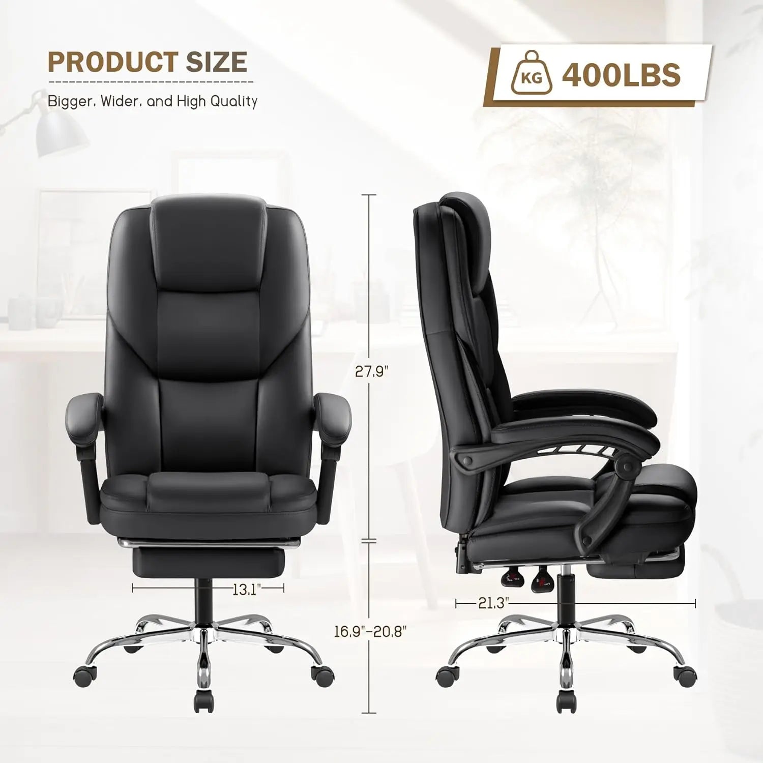 - Rigid, durable build: heavy‑duty nylon base supports up to 400 lbs; PU leather is soft, scratch‑ and stain‑ resistant, easy to wipe down for long‑term use.